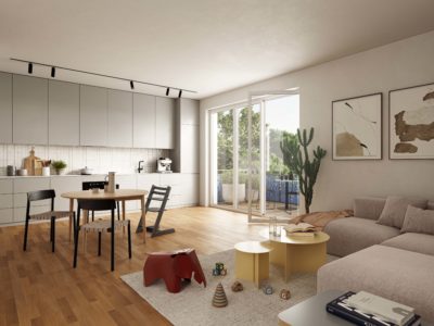 Die größeren Einheiten in den Obergeschossen mit weitläufiger Wohnküche und Balkon sind gut geschnitten, hell und freundlich – und ein Traum für Kleinfamilien